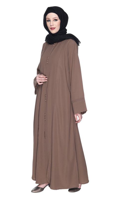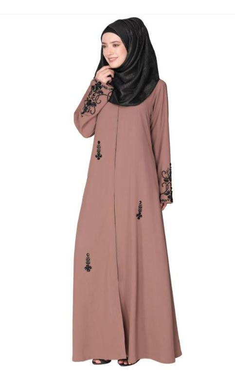 Rich Hand Embroidered Front Open Brown Abaya With Itricate Motif Of Glittering Black Beads