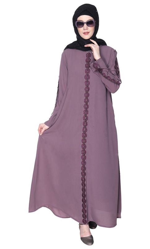 Rich Hand Embroidered Front Open Brown Abaya With Itricate Motif Of Glittering Black Beads