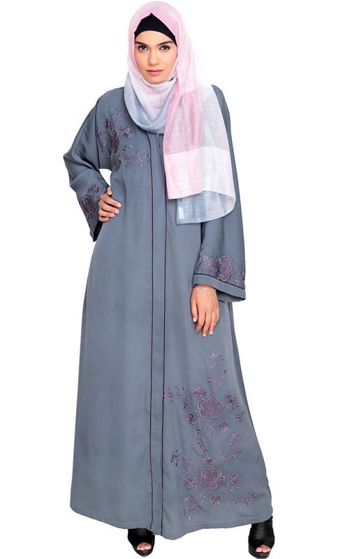 Botanical Grey Embroidered Dubai Style Abaya (Made-To-Order)