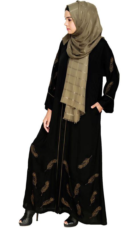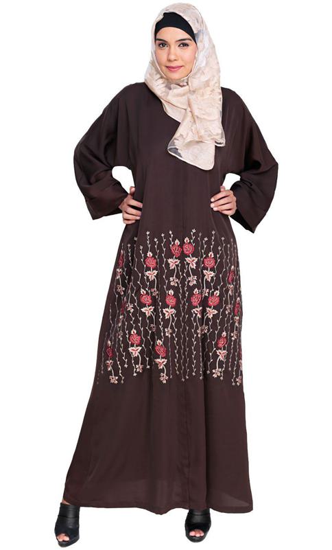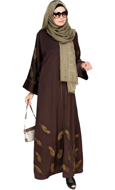 Feather Embroidered Dubai Style Dark Brown Abaya (Made-To-Order)