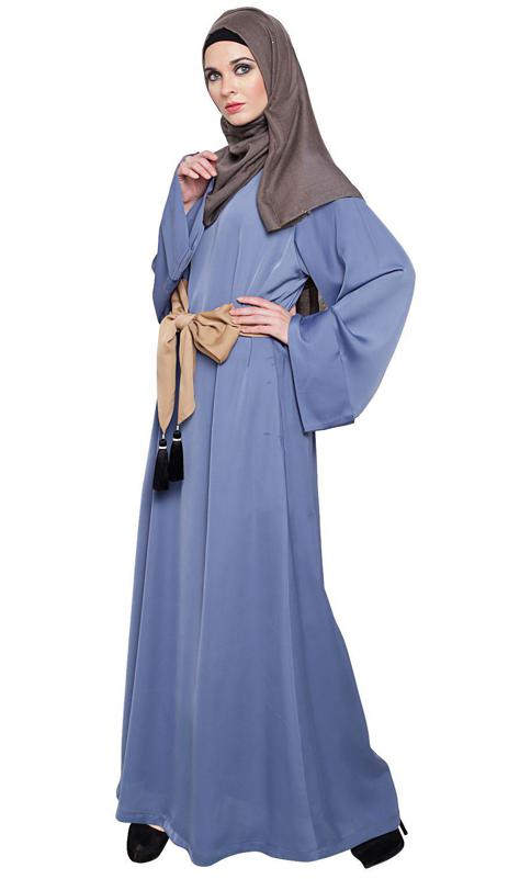 Introducing our Beautiful Tasseled Dubai Style Abaya! A perfect modest dress for you next party. This abaya comes with a round neckline, a side pocket and a belt that contains tassels to add an extra touch of flair to your overall look.