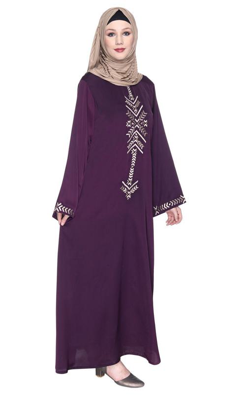 Deep Purple Front Closed Abaya With Angular Embroidery Design