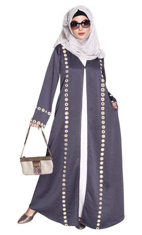 Grey Jacket Style Abaya with Exquisite Mirror Work